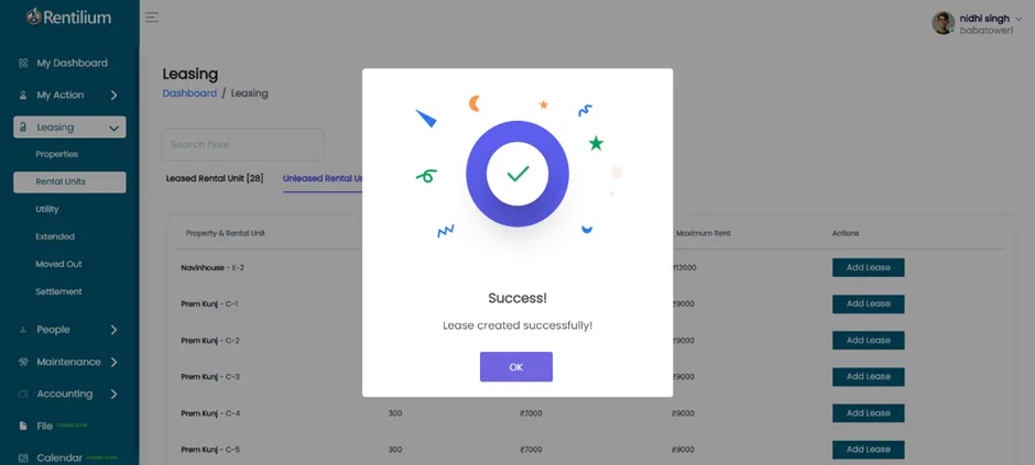 log in to your account once logged in, you will be directed to your dashboard , from where you can begin the lease creation process access rental units from the leasing section, click on rental units the detail page displays three main categories active lease vacant rental units reserved rental units click on the vacant rental unit tab to see all units available for leasing add a new lease click on the add lease after that, youβll be taken to the tenant details section after that, you will see the existing tenant and new tenant options then, click on the new tenant option after clicking on the new tenant option tenant detail page will open enter tenant details fill in the new tenant's personal information prefix (mr /ms /mrs ) first name & last name gender email address phone number aadhaar verification enter the tenantβs aadhaar number you will get the otp on registered mobile number enter the otp, if it is correct then the aadhaar will be verified once verified, proceed by clicking next enter lease details after clicking on next, the add lease page will open fill out all the fields in this section the fields include lease start date and lease end date mention the duration tenure period (months) shows the total number of months for the lease monthly rental charge monthly rent amount discount amount if applicable, fill in the discount amount provided discount period (months) mention the discount period security deposit amount mention the deposit amount late fine (per day) mention the penalty for late payments lock in period (months) minimum duration the tenant must stay after that, upload the lease agreement add energy and other charges after clicking on next add energy & other charges page will open, where you have to fill charge name name of the utility or service, e g , power backup charge type fixed or rate based default value rate per unit of usage review and submit after clicking on next preview and submit page will open on the preview & submit page, review all the entered information general information property name, unit name, rental unit type tenant information prefix, first name, last name, gender, email, phone number lease information duration, rent, discounts, and penalties lease agreement review the lease agreement energy and other charges review the energy charges lease created successfully after verifying everything, click the submit button the lease has now been created and is active